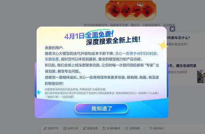 2月13日消息,文心一言在官网宣布将于4月1日0时起全面免费,所有PC端和APP端用户均可体验文心系列最新模型,以及超长文档处理、专业检索增强、高级AI绘画、多语种对话等功能。